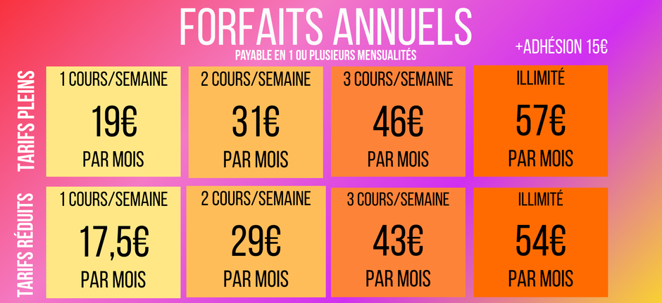 L'adhésion annuelle à l'Association s'élève à 15€, elle est obligatoire et s'ajoute au forfait choisi